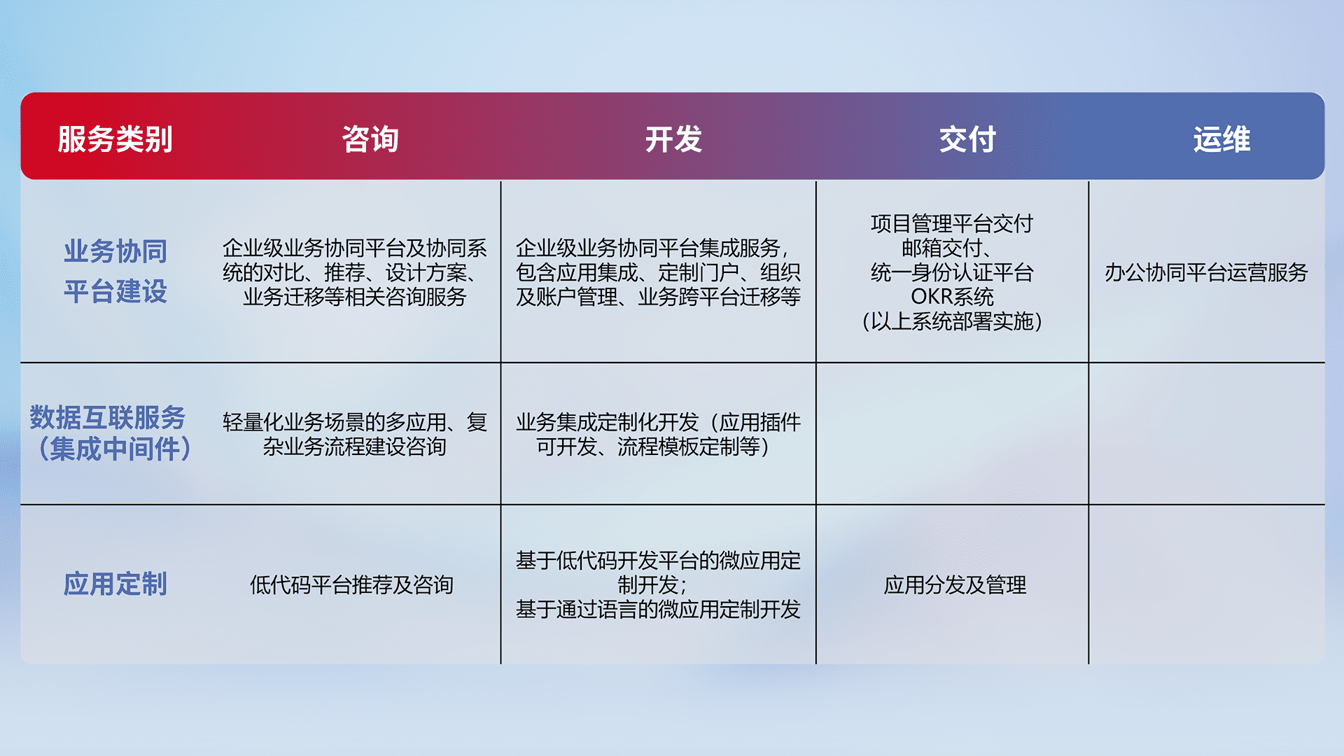 针对钉钉、、企微、、、、IDaas等平台级产品提供产品的规划、、、方案、、、、交付、、定制化开发等服务,,,实现如统一协同办公、、、智能客户服务、、、、混合会议管理、、智能数据查询、、、等业务场景,,,,实现数字化转型。。